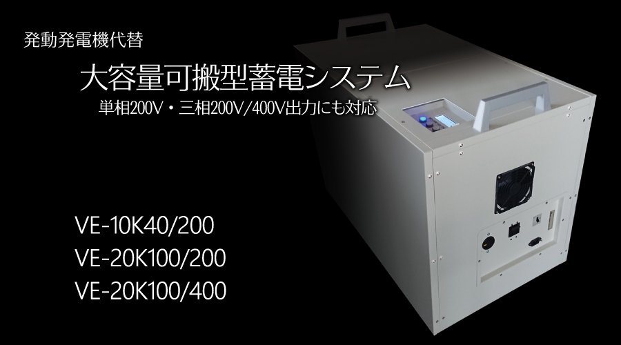 発火する恐れのないリチウム電池を搭載した蓄電システム。走行中の充電が可能な車載用と、電源がない場所での供給用のシステムを用途に合わせて使用できます。発電機の代替品として、CO2排出削減にも貢献します。